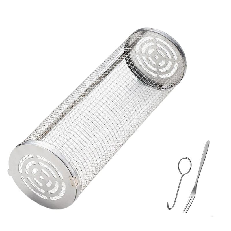 1. The rolling grill basket is cylindrical and can rotate 360 degrees to ensure even heating and cooking. No need to flip each piece of food individually. Simply place your ingredients into the cage, close the lid, lay it flat on the grill, and let it work its magic. It is perfect for gas, charcoal and other grills and suitable for grilling a variety of ingredients such as meat, burgers, fries, steaks, fish, shrimp, onions, pizza and more.