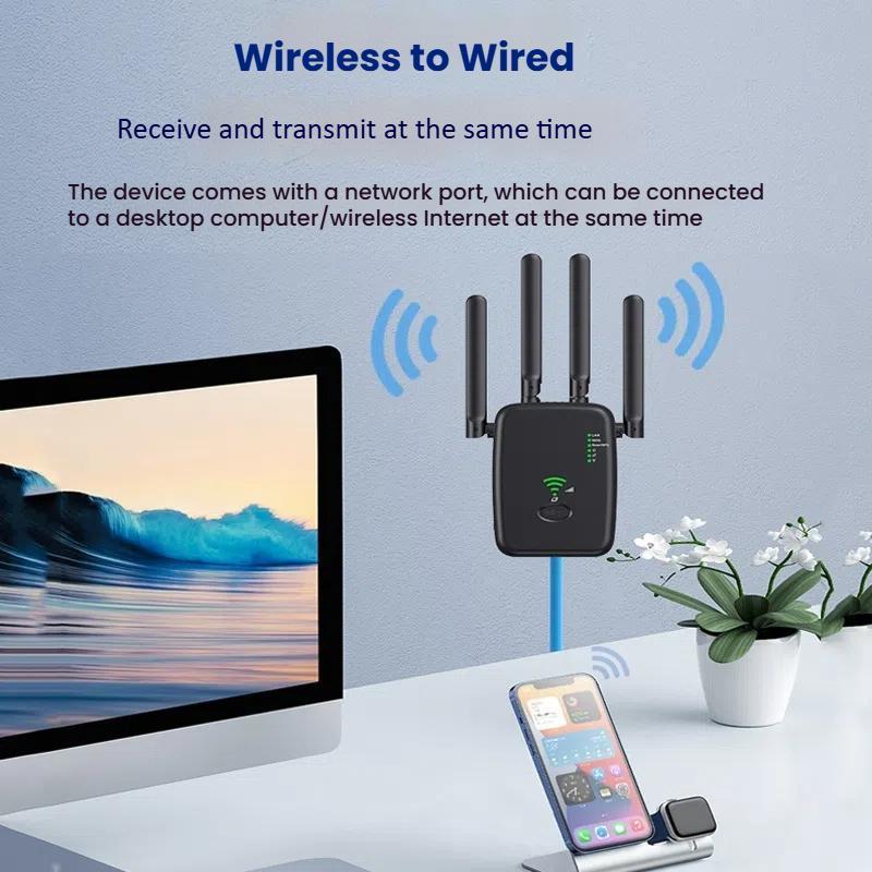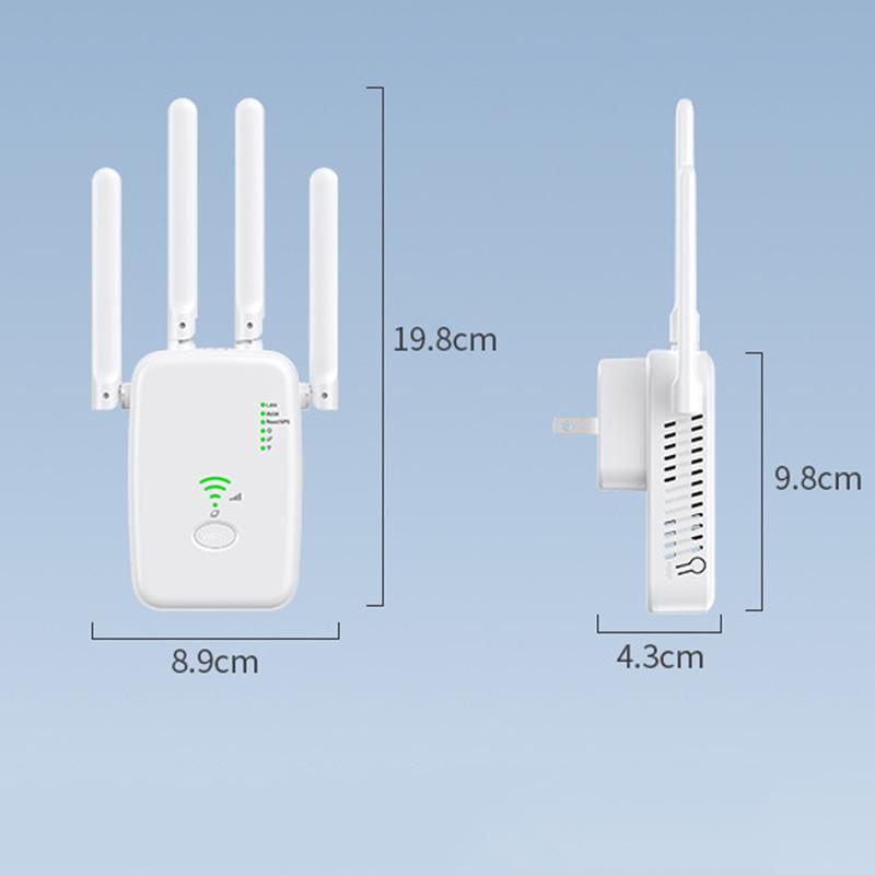 1. 1200M dual-band WiFi range extender adopts 802.11 ac technology to expand coverage improve the signal strength of existing wireless networks and eliminate dead spots. Simultaneous 1200 Mbps dual-band transmission rate, up to 5GHz 867Mbps + 2.4 GHz 300Mbps