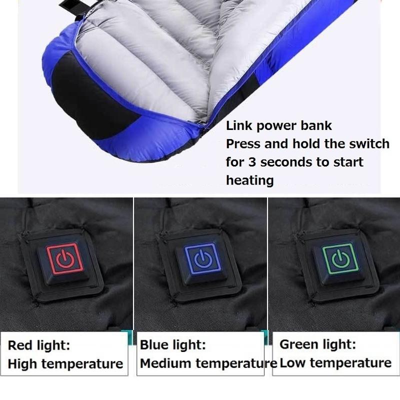 1. Sleeping bag that can be heated, 3 temperature adjustable (40-45 degrees Celsius / 45-50 degrees Celsius / 50-55 degrees Celsius)