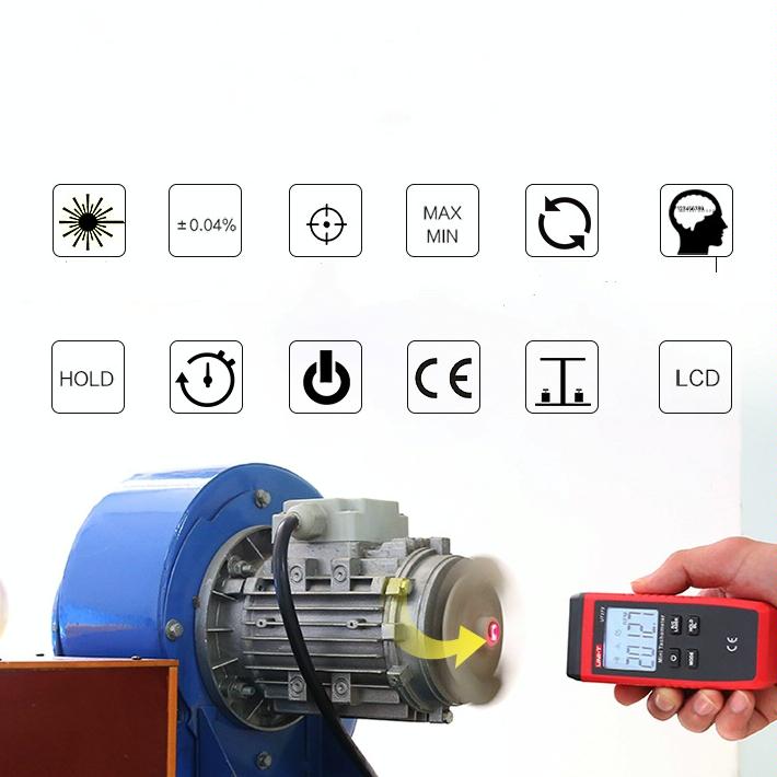 2. Digital non-contact tachometer for measuring the speed of motors and other machines. The device is capable of displaying the results in RPM or revolutions. The portable device is capable of safely measuring a rotating object by a non-invasive method.