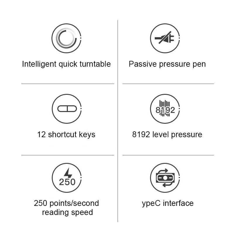 12. The product includes: tablet*1, pressure-sensitive pen*1, pen case*1, pen holder (including 8 nibs)*1, pen tip*20, pen picker*1, data cable*1, drive prompt Card*1, quick installation guide*1