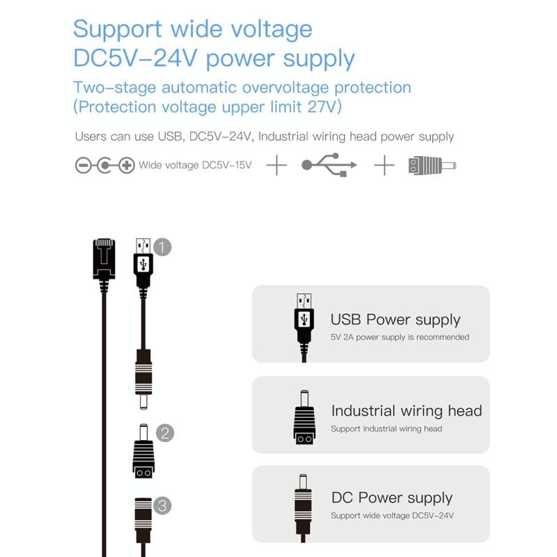 2. Support wide voltage DC 5-24V power supply, two-stage automatic overvoltage protection, overvoltage protection point 27V, suitable for industrial environment applications.