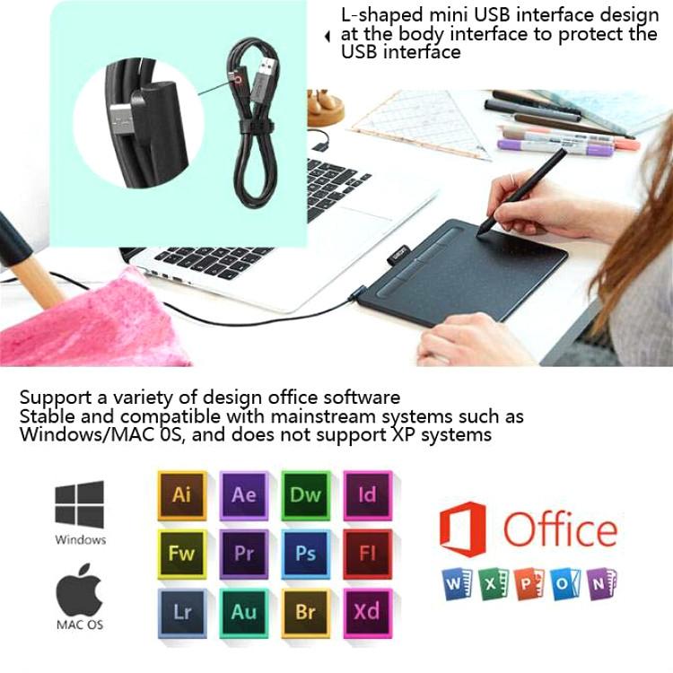 9. Packing list: 1 pressure-sensitive pen, 3 standard replacement nibs built in the pen body, 1 1.5-meter L-shaped USB cable, 1 digital tablet