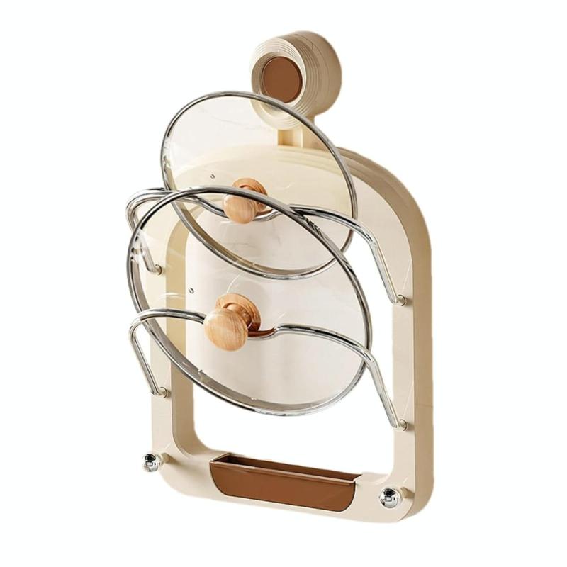Wall Mount Pot Lids Holder No Punching Suction Cup Double Layer Storage Rack(Milk Tea Brown)