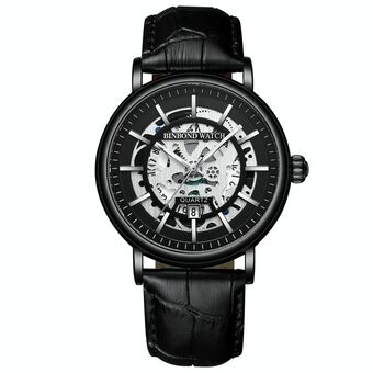 BINBOND B5011 Gear Hollow Outdoor Waterproof Luminous Men Business Watches(Black Leather Black Steel) (BINBOND)