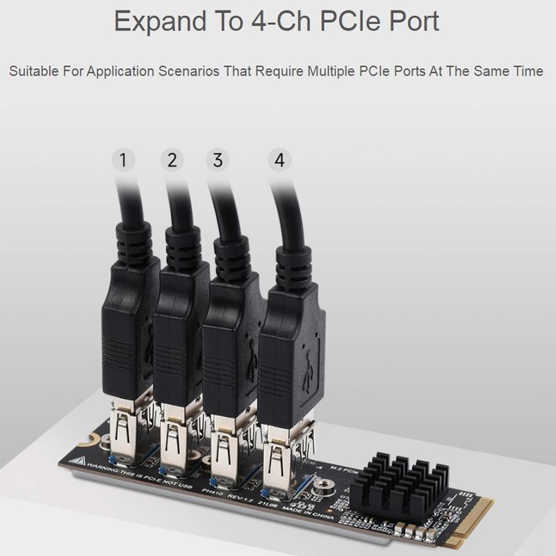 3. For M.2 M interface to PCIe port, M2-PCIe-Switch-4P supports 1-Ch M.2 M to 4-Ch PCIe X1 (Note: output is PCIe X1 port, not USB port)