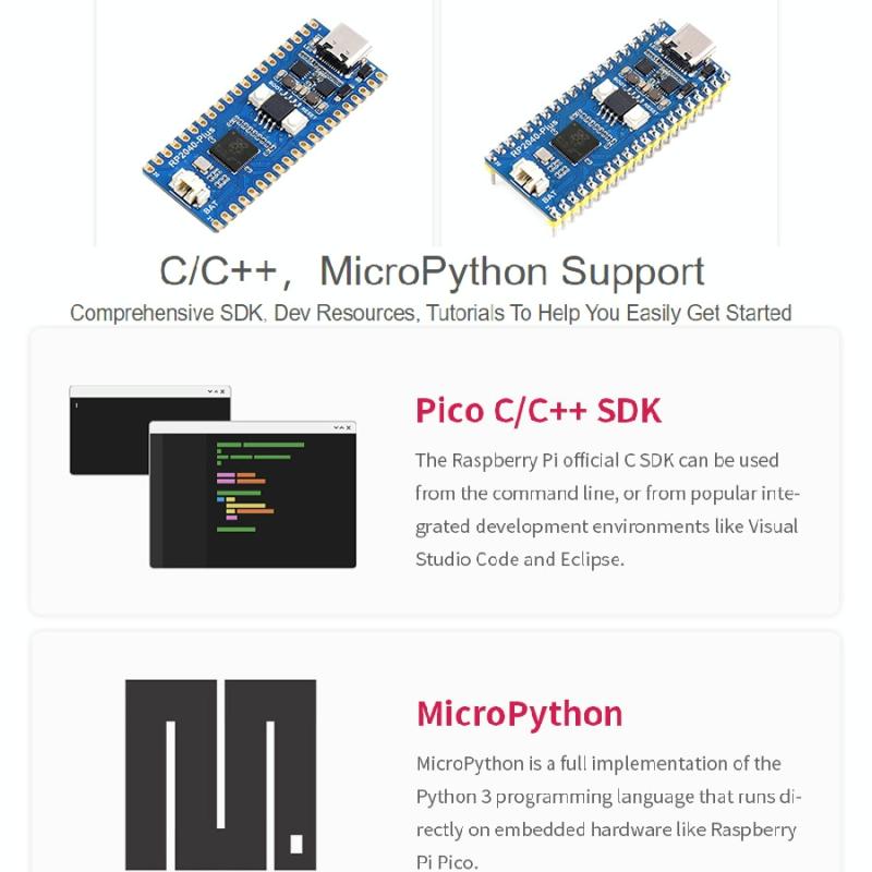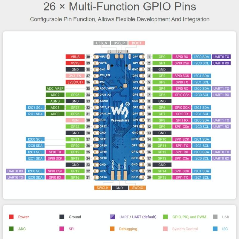 As same as Raspberry Pi Pico, it incorporates the RP2040 microcontroller, with dual-core Arm Cortex M0+ processor running up to 133 MHz, and 26x multi-function GPIO pins.