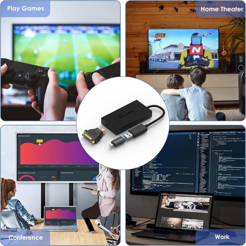 1.Connect multiple USB 3.0 display adapters to your computer to expand your screen space for resolutions up to 3840x2160@30Hz and also compatible with 1920*1080@60Hz resolution. Includes HDMI to DVI and USB A-C adapters are supplied for added flexibility. Ideal for different home and office workspace applications, home theater, video conference, corporate training, etc.
