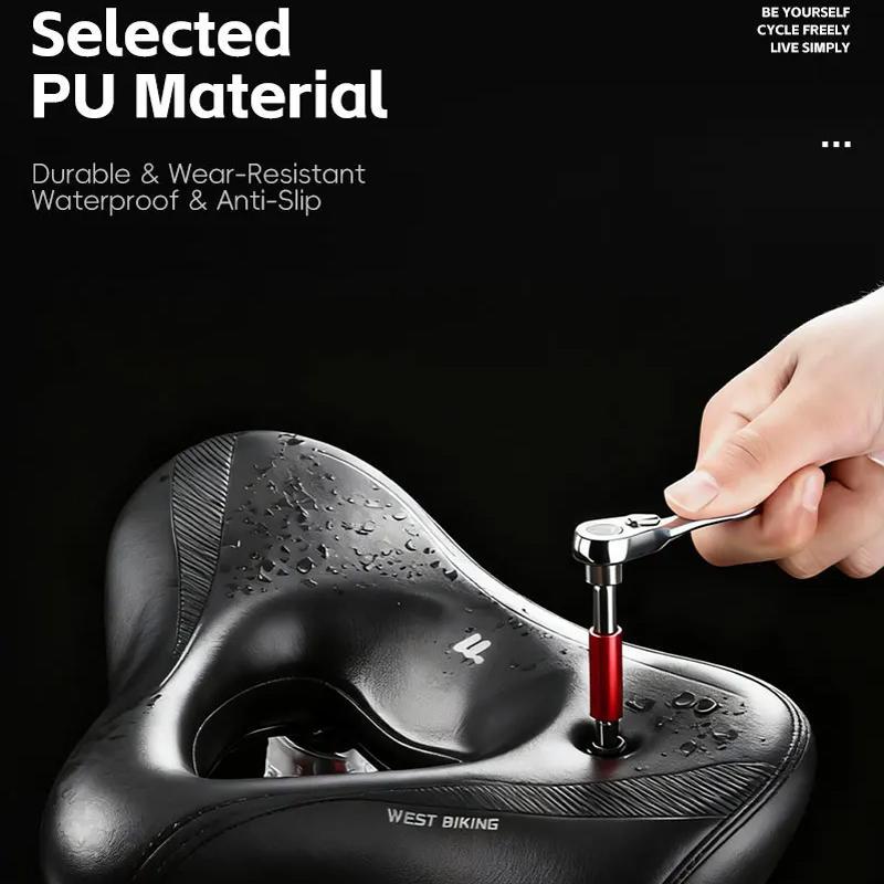 1. This bicycle saddle is designed for mountain and road bikes, featuring a wide, shock-absorbing seat with ventilation to enhance comfort during long rides. It incorporates a hollow design, PU leather cover, and high-elasticity springs for durability and support.