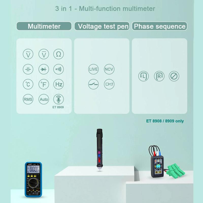 1. 3-in-1 multi-function multimeter, integrated digital multimeter/voltage tester/phase sequence (phase sequence function only ET8908/ET8909)
