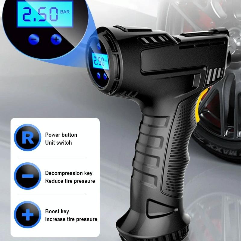 1. The air pump has a built-in 2000mAh rechargeable lithium-ion battery, which can continuously inflate your car tires at a speed of 25 L/Min. (Only the wireless model has built-in lithium battery)