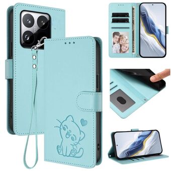 For Xiaomi 15T 5G Embossed Heart Cat Leather Phone Case with Hand Strap(Mint Green)