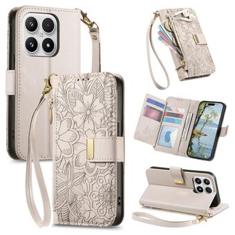 For Xiaomi 17 Flowers Leaves Zipper Wallet Leather Phone Case with Strap(Khaki)