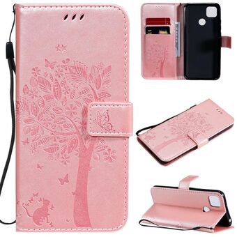 For Xiaomi Redmi 9C Tree & Cat Pattern Pressed Printing Horizontal Flip PU Leather Case with Holder & Card Slots & Wallet & Lanyard(Rose Gold)