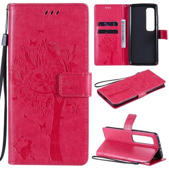 For Xiaomi Mi 10 Ultra Tree & Cat Pattern Pressed Printing Horizontal Flip PU Leather Case with Holder & Card Slots & Wallet & Lanyard(Rose Red)