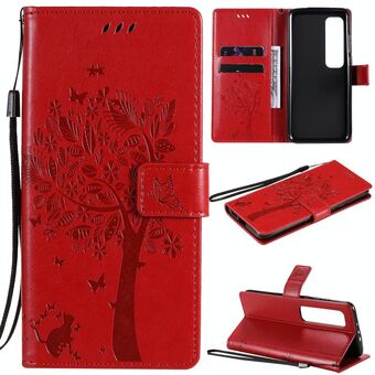 For Xiaomi Mi 10 Ultra Tree & Cat Pattern Pressed Printing Horizontal Flip PU Leather Case with Holder & Card Slots & Wallet & Lanyard(Red)
