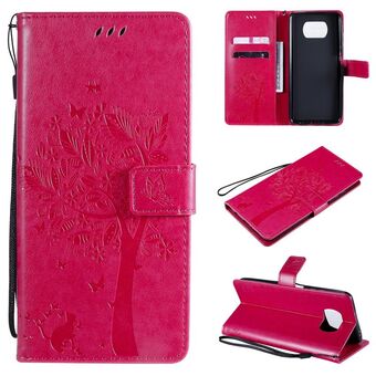 For Xiaomi Poco X3 NFC Tree & Cat Pattern Pressed Printing Horizontal Flip PU Leather Case with Holder & Card Slots & Wallet & Lanyard(Rose Red)