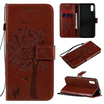 For Xiaomi Redmi 9A Tree & Cat Pattern Pressed Printing Horizontal Flip PU Leather Case with Holder & Card Slots & Wallet & Lanyard(Coffee)