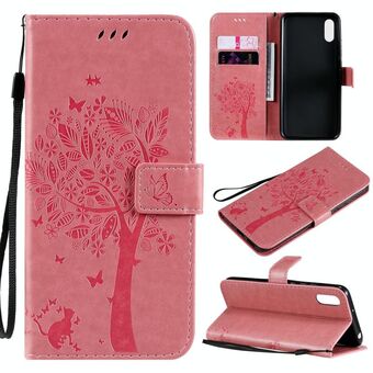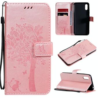 For Xiaomi Redmi 9A Tree & Cat Pattern Pressed Printing Horizontal Flip PU Leather Case with Holder & Card Slots & Wallet & Lanyard(Pink)