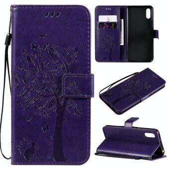 For Xiaomi Redmi 9A Tree & Cat Pattern Pressed Printing Horizontal Flip PU Leather Case with Holder & Card Slots & Wallet & Lanyard(Purple)