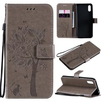 For Xiaomi Redmi 9A Tree & Cat Pattern Pressed Printing Horizontal Flip PU Leather Case with Holder & Card Slots & Wallet & Lanyard(Gray)