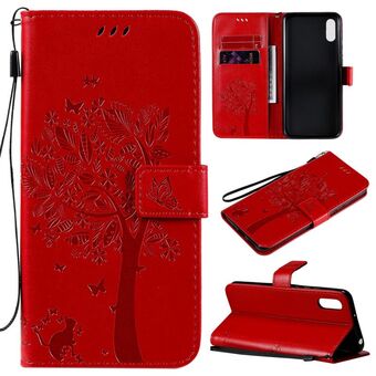 For Xiaomi Redmi 9A Tree & Cat Pattern Pressed Printing Horizontal Flip PU Leather Case with Holder & Card Slots & Wallet & Lanyard(Red)