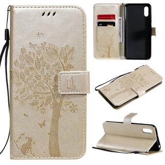 For Xiaomi Redmi 9A Tree & Cat Pattern Pressed Printing Horizontal Flip PU Leather Case with Holder & Card Slots & Wallet & Lanyard(Gold)