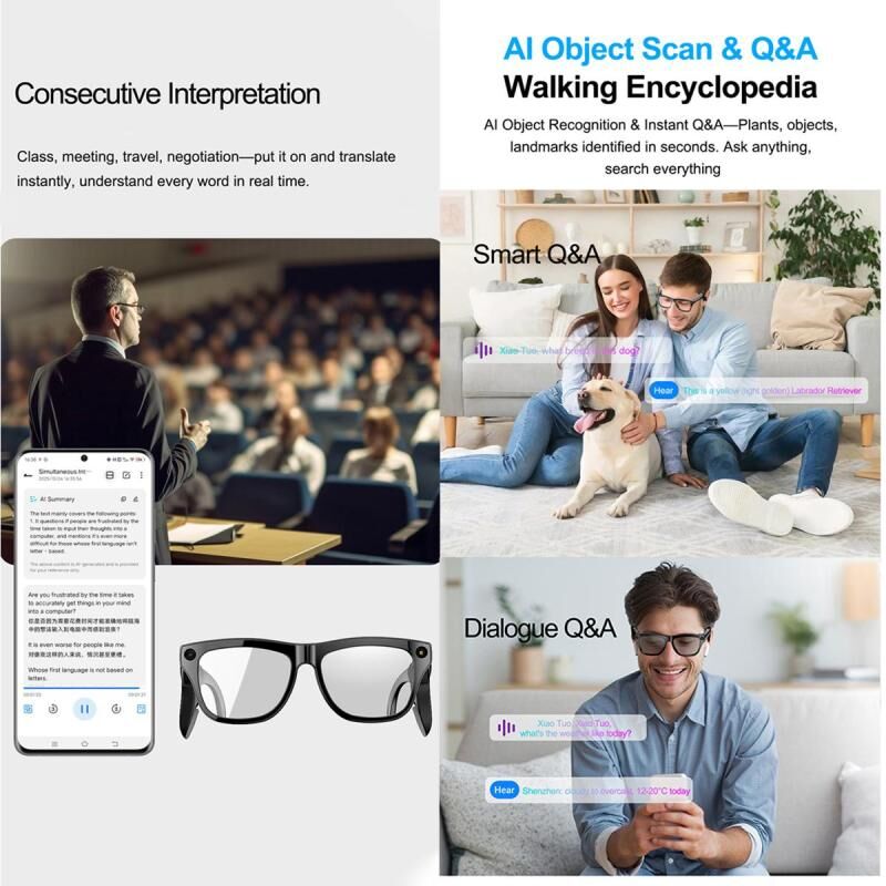 Supports real-time translation of 10 major languages ??(Chinese, English, Japanese, Korean, German, French, etc.), offering two modes: AI translation and simultaneous interpretation, with an accuracy rate exceeding 95%. Business Negotiations: When communicating with foreign clients, the glasses can provide real-time translation of conversations, eliminating the need for human translators and making communication more efficient.