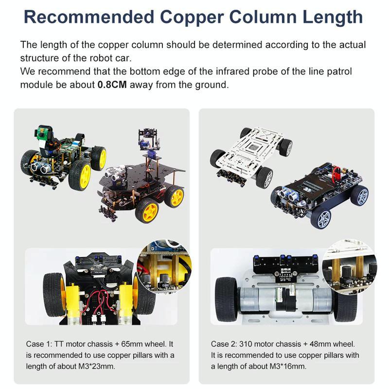 3. You can connect it to the intelligent car or expansion board using jumper wires or DuPont cables for various experiments. The module is reserved with holes for installing copper columns and screws, making it convenient for you to expand by yourself.