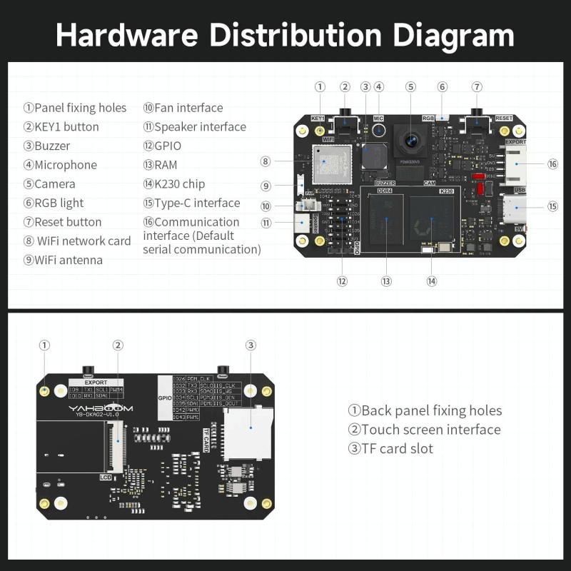 2. On board 2MP camera(GC2093), 2.4-inch touch screen, microphone, RGB light, WiFi network card and other hardware resources, support TF card (32G TF card inchude).