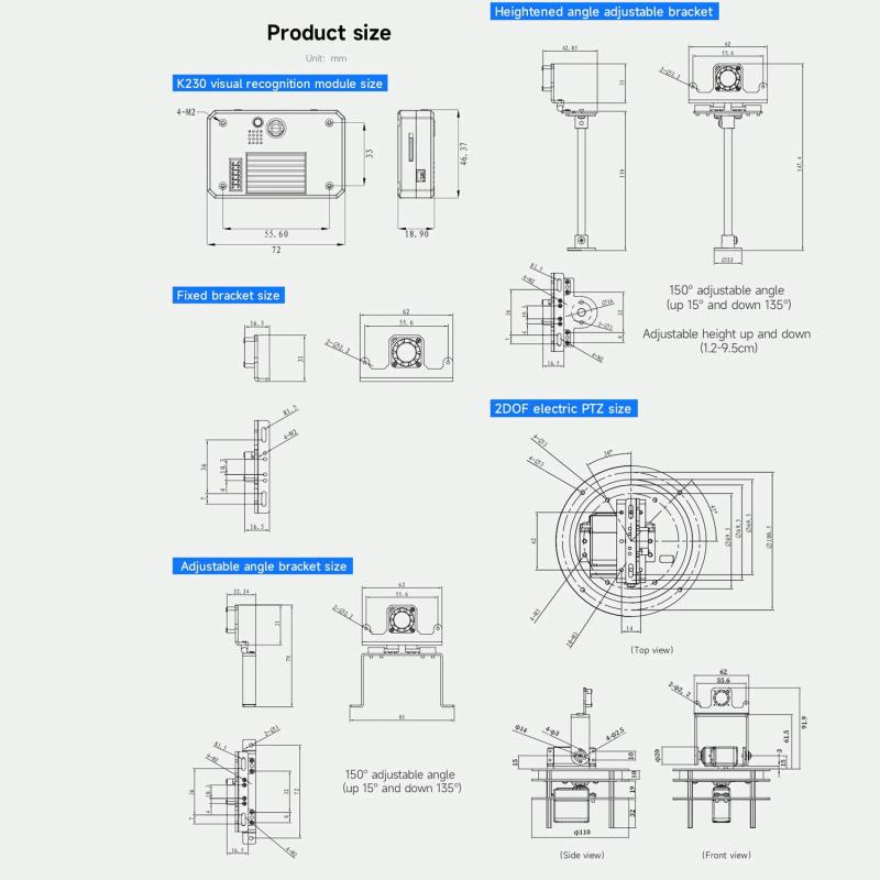 6. Three different height brackets and 2DOF electric PTZ are available, users can fix the module on some robots or smart cars.