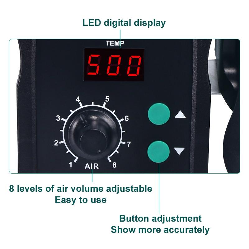 6. Hot air gun with strong power, warming-up quickly, soft airflow outlet, large airflow, extremely suitable for lead-free soldering work.