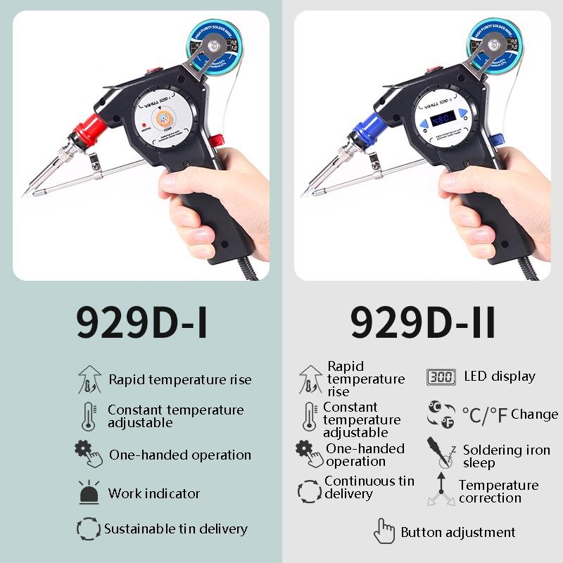 7. Function: 929D-I (rapid heating, adjustable constant temperature, one-handed operation, working indicator, continuous tin delivery), 929D-II (rapid heating, adjustable constant temperature, one-handed operation, working indicator, sustainable Send tin, LED display, Celsius/Fahrenheit conversion, soldering iron dormancy, temperature correction, key adjustment)