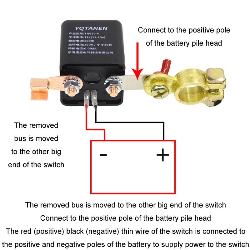 1. Move the removed bus to the other big end of the switch, connect it to the positive pole of the battery, and connect the red (positive) and black (negative) thin wires of the switch to the positive and negative poles of the battery to supply power to the switch