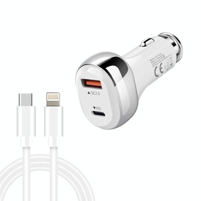 YSY-312PD QC3.0 18W USB + PD 20W USB-C / Type-C Car Charger with Type-C to 8 Pin Data Cable(White)