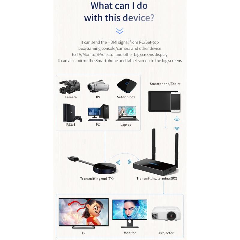 2.Point-to-point HDMI wireless transmission, can be used once you insert the HDMI plug into the device, transmission distance 30 meters.